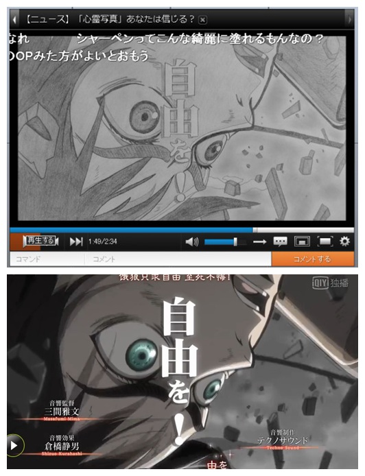 《進擊的巨人》OP對比圖(上圖為鉛筆手繪版截圖,下圖為原版截圖)