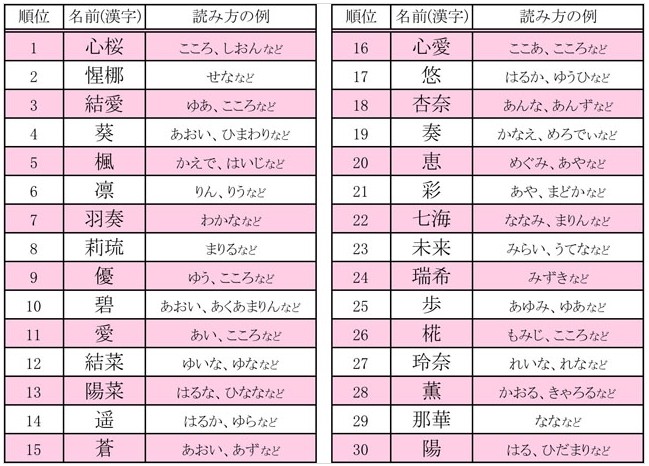 日本女孩人氣名字排名 “心櫻”獲得第一