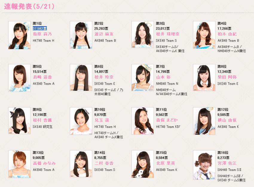 AKB48第六屆選拔總選舉速報結果(官網截圖)