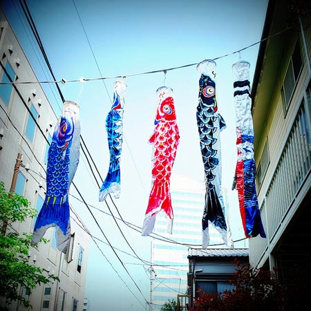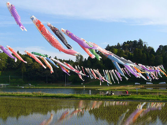 而民眾在庭園前掛起鯉魚旗的習俗興起的時間大概是在江戶時代(1603年至1867年),當時還只限于政治中心所在地暨日本的關東地區,而在傳統政治中心京都一代并不常見。據稱,懸掛鯉魚旗的傳統也起源于黃河鯉魚跳過龍門的中國古代傳說,飽含著對家里男丁有所出息的祝愿。日本鯉魚旗由五種顏色的風幡組成,每次懸掛由三條以上構成。