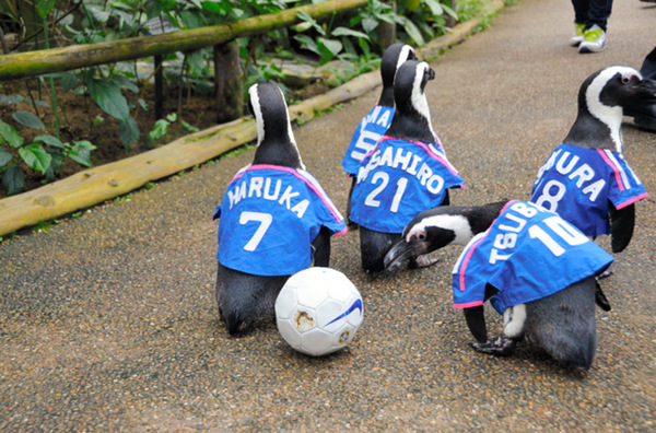 “企鵝版世界杯”是由一名酷愛足球的飼養員策劃舉辦的。公園里,企鵝們身穿與日本隊球員相同的藍色隊服,像模像樣地爭搶著足球。如果隊員之間出現打架等行為的話,還會收到黃牌警告。遇到性質特別惡劣的情況,隊員甚至會被請下場休息,但是由于沒有候補隊員,所以第二天它依舊會上場比賽。