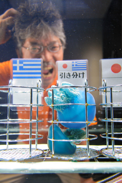 水族館負責人在水母生活的圓形水槽里放入“日本勝”、“平局”、“希臘勝”三個小筐,靜靜地等待水母到底會選擇進入哪一個。剛開始的時候,藍色水母慢悠悠的游近了“日本勝”的小筐,可惜沒有成功進入。猶豫了片刻之后,兩只水母紛紛選擇了“平局”的小筐。幾名前來參觀的游客表示:“它們也許是太焦躁了,但是這只是水母的選擇,我們相信日本隊的表現”?上,今天早晨日本對希臘的比賽中,經過90分鐘的鏖戰,依舊未能打破藍色水母的“預言”。(編譯:陳思 審稿:陳建軍)