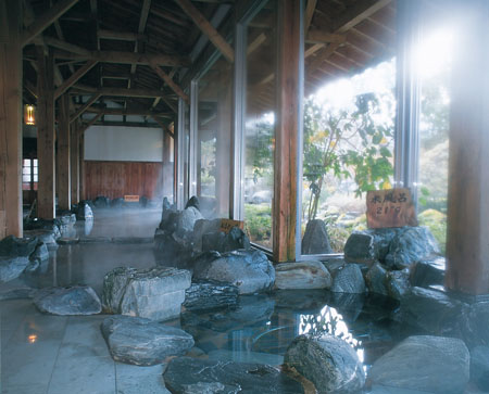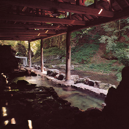 這里有著眾多的旅館,歇腳之處的旅館有的有沿河的巖石浴室,有的有透過庭院可以遠眺群山的露天溫泉。游人來這里一邊泡著溫泉,一邊體味春去冬來的四季美景。