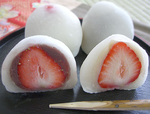 草莓大福是20世紀80年代問世的日式點心。大福類似于我們所說的摩提,糯米面皮包著豆沙餡,中間放入一顆新鮮的草莓就是草莓大福了。在日本,草莓大福常是冬季到春初的季節限定點心。