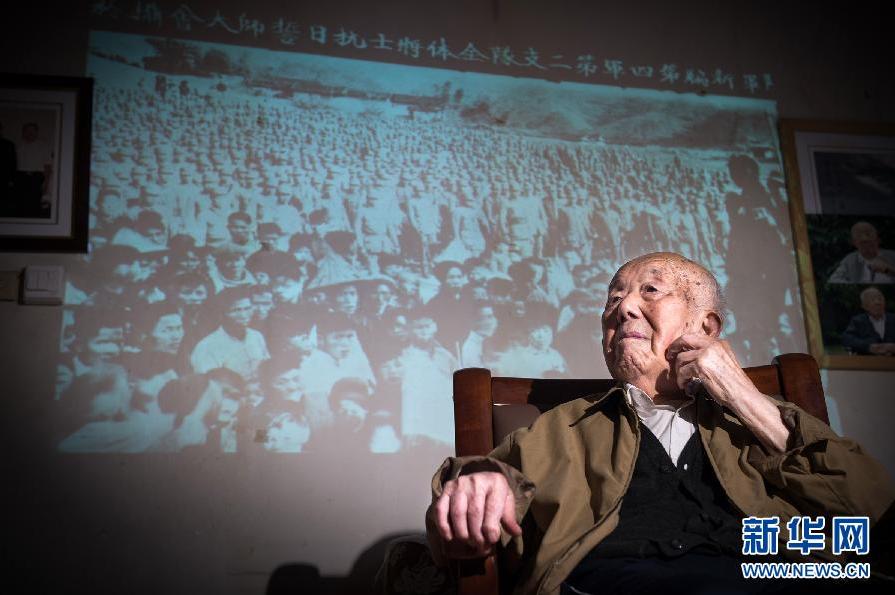 投影照片為新四軍第二支隊全體將士群情激昂,舉行抗日誓師大會(新華社資料照片)。
