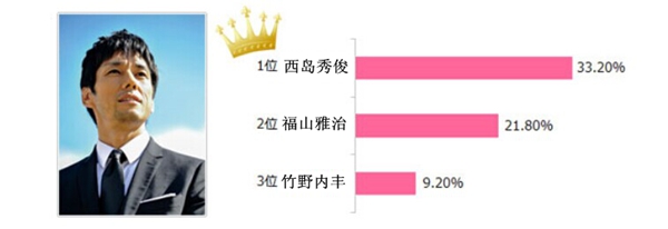 而問道“你認為具有成熟魅力的40多歲男演員有誰”時,西島秀俊大叔以33.2%的支持率力壓福山雅治登頂,另一中年帥哥竹野內豐排在了第3位。