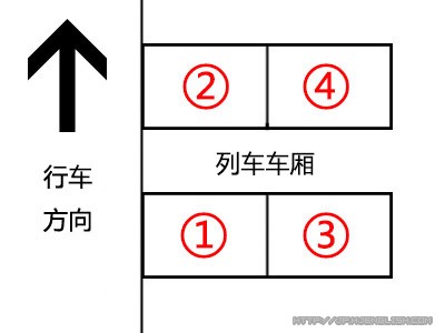 最后是在列車車廂內的座位地位排序。如圖所示,這是一個在走廊左邊的車廂(右車廂則為對稱情況)。列車車廂內的排序較為簡潔明了,首先依然是里座居上的原則,其次,正臉所對與列車行車方向一致的地位較高。因此地位最高的座位是左下角的①處,而右上角的④則地位最低。常去外地出差的職業一般需要多加注意這一點。