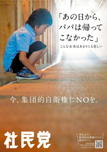 在海報中,一個小男孩孤獨地蹲在地上,口中喃喃自語著“從那天起,爸爸就再也沒有回來”。社民黨方面希望以此來傳達“自衛隊員的生命安全與所有日本國民的命運息息相關”這樣一個主旨。