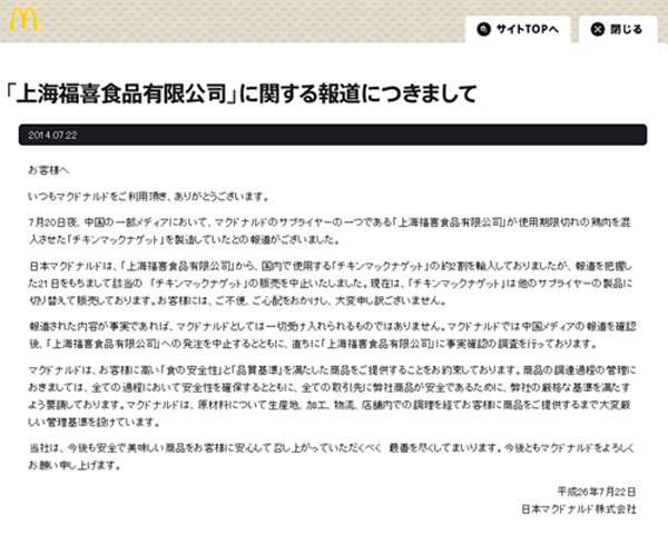 人民網東京7月22日電 (滕雪) 日本麥當勞官網22日發布聲明,稱因近日曝光的上海福喜食品有限公司使用過期雞肉制作“麥樂雞”的事件,出于食品安全考慮,使用該公司原料的“麥樂雞”已于21日停止銷售。聲明稱,日本國內出售的麥樂雞中,20%的雞肉原料由上海福喜供應。