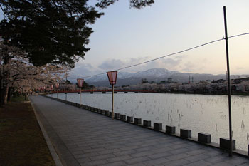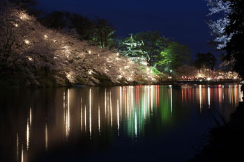 此處的櫻花也十分有名,被評為日本三大夜櫻之一。在高天城三重望樓上懸掛著3000多個燈籠,當它們被點燃時,柔潤的燈光透過紙面,融入夜色,點亮了城下4000多株開得如火如荼的絢爛櫻花與下面的水面,星光、燈光、波光、中間飄飄揚揚的花瓣,如夢似幻,讓人如癡如醉,一時不知身在何方。