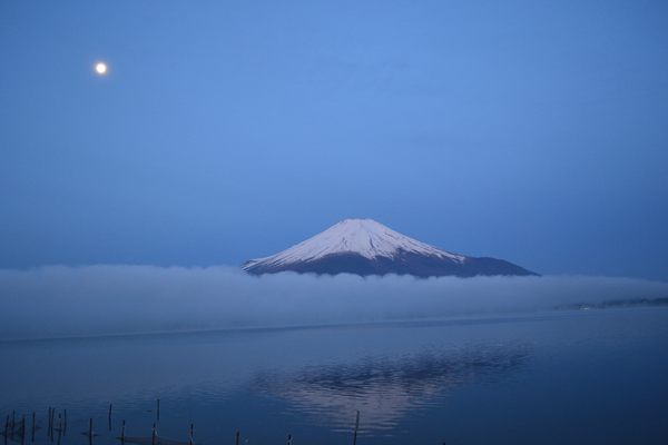 日出的時刻,還未落下的月,與映在山中湖中的富士山。