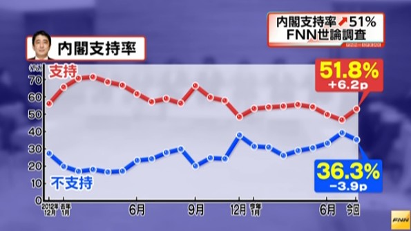 近期進行的輿論調查顯示,安倍內閣的支持率較7月份上升了6個點,重新回到50%以上達到51.8%。而不支持率也下降了3.9%,為36.3%。7月份安倍政權宣布決定修改憲法解釋解禁集體自衛權后,內閣支持率曾降至47.8%。