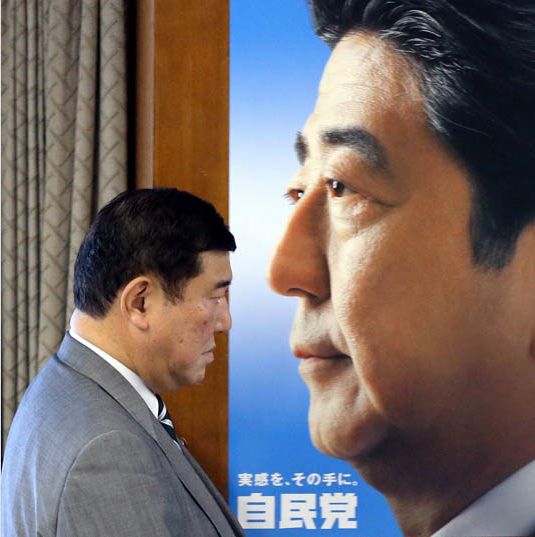 日本自民黨現任干事長石破(左)和首相安倍晉三的海報。