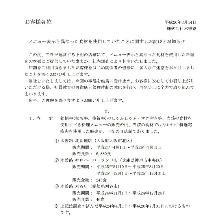 主營日式涮鍋的日本高級料理店品牌“木曾路”被爆出使用便宜牛肉冒充高檔牛肉牟利,該料理店已于8月14日在官網上發表了致歉聲明。