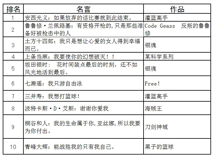 排在第二位的名言來自講述未來日本兩名少年用特殊手段對抗巨大帝國的科幻機器人動畫《Code Geass 反叛的魯魯修》,其主人公魯魯修的名言“有資格開槍的,只是那些準備好被槍擊中的人”深深震撼了粉絲們的心。