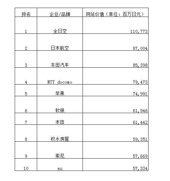 調查顯示,日航以870億日元的網站價值屈居全日空之后排在第二位。豐田汽車以854億日元排在第三位。NTTdocomo今年排超過蘋果、軟銀和索尼,從去年的第7位一躍升至第4位。(編譯:馬瀟漪 審稿:陳建軍)