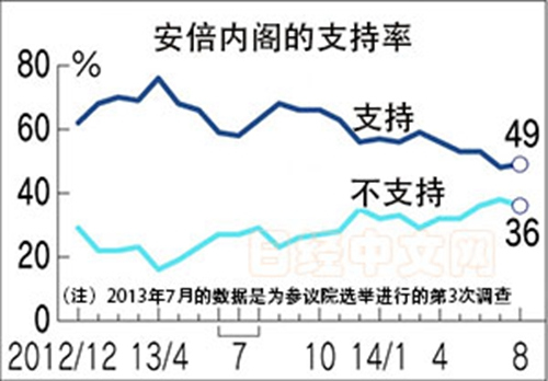 《日本經濟新聞》和東京電視臺于8月22至24日實施的輿論調查顯示,安倍政權的內閣支持率為49%,較7月份上次調查時上升1個百分點,幾乎持平。反對者中,認為其“政策不好”的受訪者最多。
