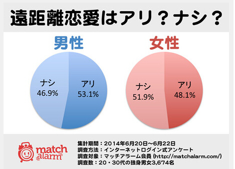 人民網東京8月29日電 日前,利用Facebook 開展婚戀網上服務的日本matchalarm公司在戀愛、婚姻方面,對3674名單身男女開展了調查。針對“您是否接受異地戀”這個問題,表示“接受”的人群中,男性占53.1%,女性占48.1%,男女均有約半數人接受異地戀。在接受異地戀的人中,有些觀點頗為引人注目。許多男性認為“信任對方就好”、“兩人間有愛就夠了”,而許多女性則認為“可以有自己的時間”、“能使雙方保留隱私”。而表示“不接受”的人群中,男女雙方均有很多人認為“無法見面,太寂寞”。