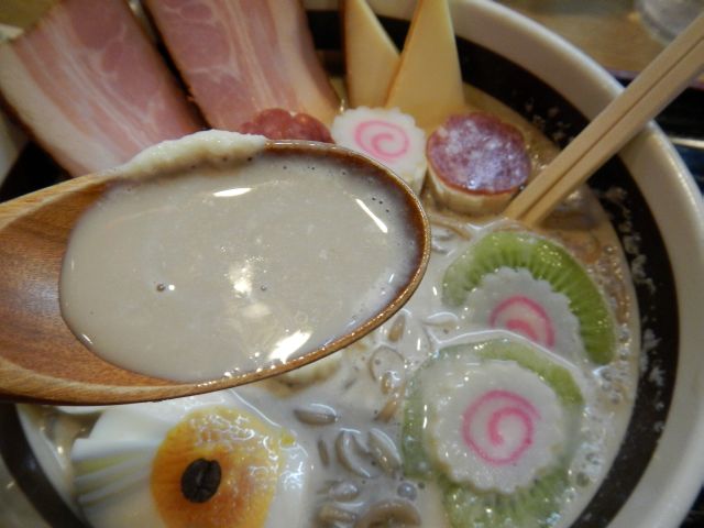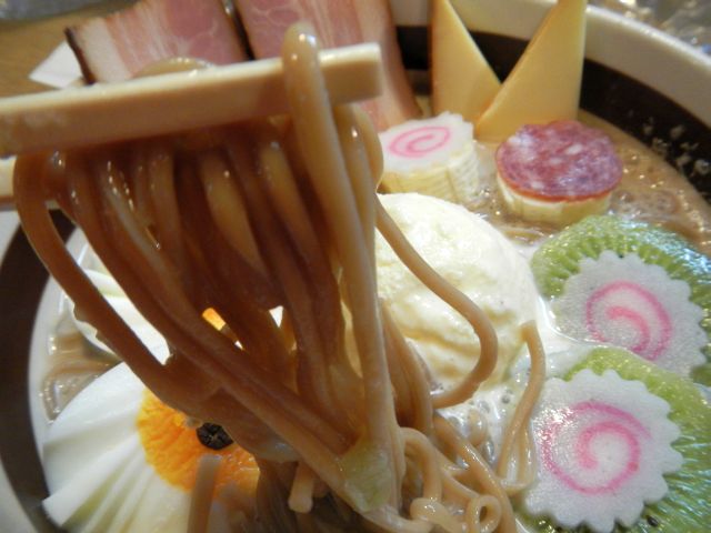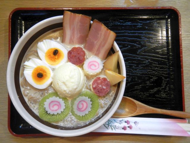 拉面一端上來,濃郁的咖啡香撲鼻而來。不過,可不能被這甜香沖昏了頭腦。淡褐色的牛奶咖啡上擺放著香蕉、薩拉米香腸、獼猴桃、魚板。水煮蛋上竟然還放著幾顆咖啡豆……還有培根和熏干酪死守后衛。位于正中間的,竟然是一坨威風凜凜的香草冰淇淋!天哪!