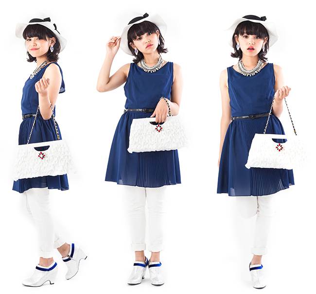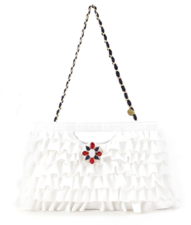 而另一款則是以動畫片《魔術快斗》主人公為主題的“怪盜基德款”。這一款女包以白色荷葉邊為主,兩面均使用羅緞面料,搭配紅藍寶石胸針。掛上鏈條也可斜跨。價格為9800日元(不含稅)。