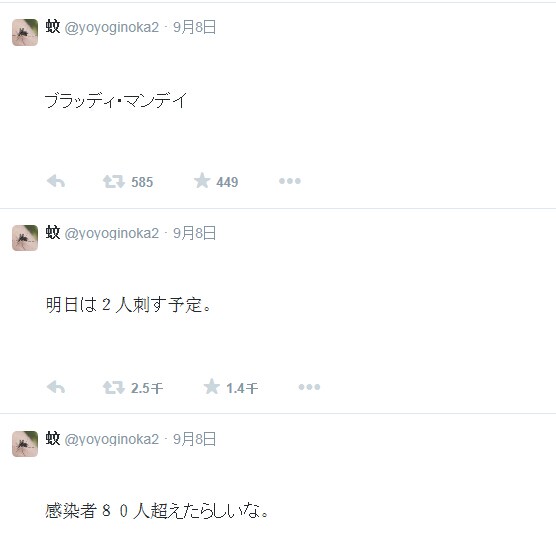 日本登革熱感染者不斷增多,代代木公園的大部分區域以及新宿御苑也已暫時關閉。而就在此時,日本推特上出現了一個名為“住在代代木公園里的蚊子(@YOYOGINOKA)”的用戶,引起了廣大網民關注。