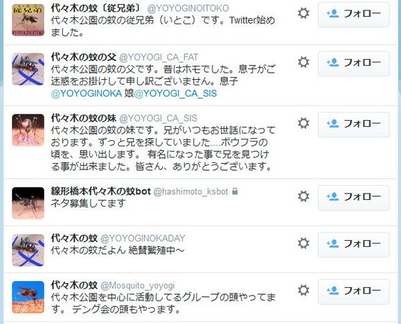 目前,該賬號已被凍結,但很快,模仿該“蚊子”的其他賬號也一一登場,不僅有“代代木的蚊子”,還有“代代木蚊子的父親”、“妹妹”、“朋友”甚至它的前世——一只狗?疵炙坪鹾汀拔米印倍际恰耙患胰恕。這些賬號間是什么關系?它們的始祖“蚊子”的賬號為什么被凍結?這樣的賬戶還會增加嗎?它們的目的是什么?有關“住在代代木公園的蚊子”真是謎團重重。(編譯:袁蒙 審稿:陳建軍)