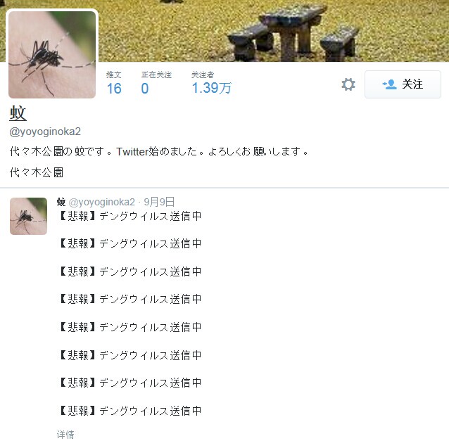 人民網東京9月11日電 日本登革熱感染者不斷增多,代代木公園的大部分區域以及新宿御苑也已暫時關閉。而就在此時,日本推特上出現了一個名為“住在代代木公園里的蚊子(@YOYOGINOKA)”的用戶,引起了廣大網民關注。