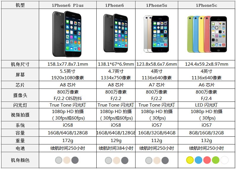 iPhone6 Plus、iPhone6、iPhone5s、iPhone5c參數對比圖