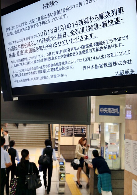 人民網東京10月13日電 據《朝日新聞》網站報道,19號超強臺風逼近,導致13日的西日本交通大規;靵y,相繼有大型活動被迫終止或延期。