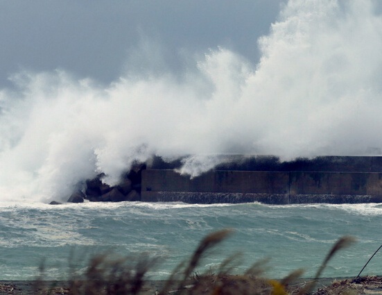 臺風逼近,大浪沖破防波堤(圖片來源:朝日新聞)