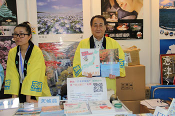 左圖:茨城縣上海事務所橘秀幸所長在2014年北京旅博會上