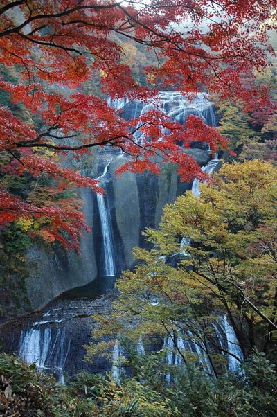 左圖:茨城縣景點·紅葉包裹下的袋田瀑布