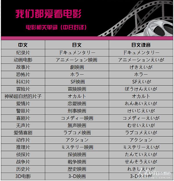第27屆東京國際電影節的影片大戰正在日本東京激烈地上演,愛好電影的朋友在焦急等待獲獎名單的同時,學習一下電影相關單詞的日語說法也是個不錯的選擇。