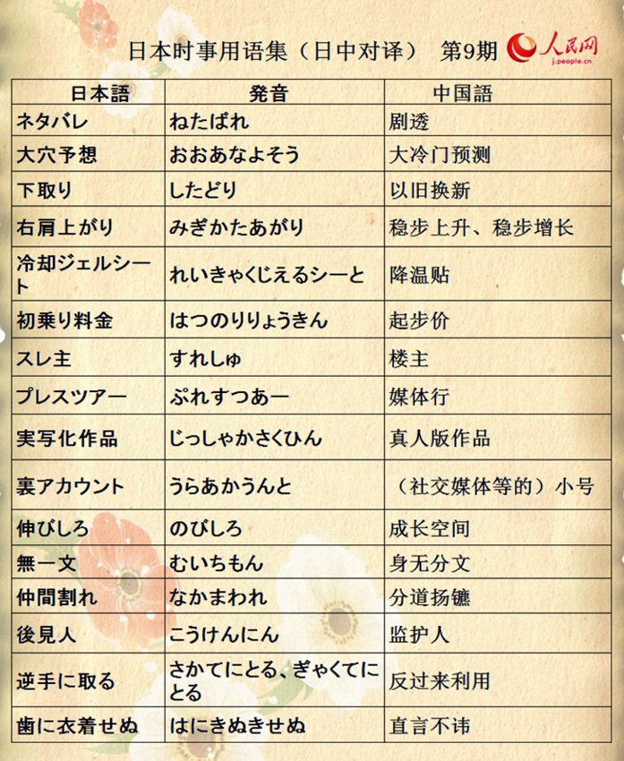 為方便讀者理解日本新聞,學習報道中的新詞,人民網日本頻道開設《日本時事用語集(日中對譯)》板塊。板塊中廣泛收錄日本新聞報道中常用的政治、經濟、社會、文化等方面的詞匯,并將定期更新。希望該板塊能夠給讀者朋友們帶來幫助。