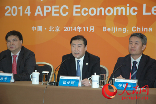 商務部國際司司長張少剛介紹APEC高官會成果。(人民網記者 劉陽 攝)