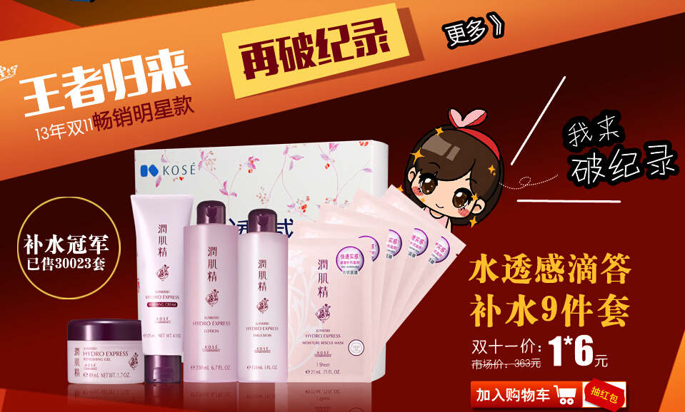 高絲旗艦店在雙11當天除推出優惠套裝、力度折扣、滿贈活動外,11號下單并在25號前確認收貨送淘寶電影代金券20元,0-2點隨機免單,還有特供福袋。