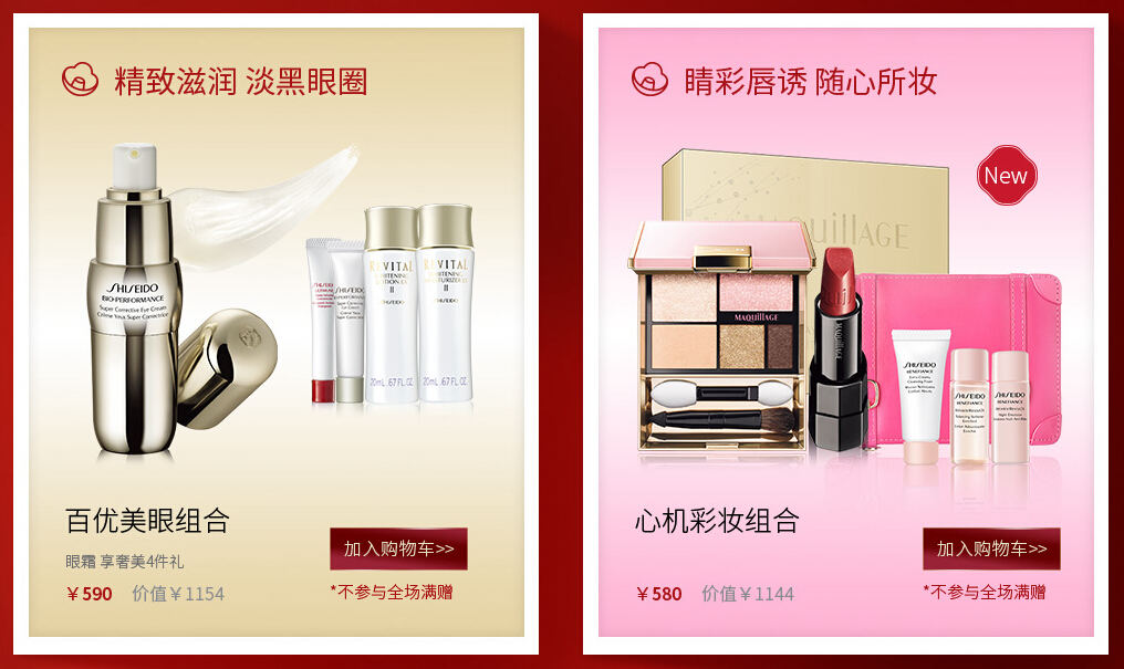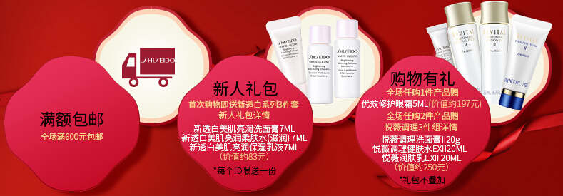 同時,資生堂天貓旗艦店還推出了“臻美組合”套裝,價值1100多元的百優美眼組合和心機彩妝組合現價都只要500多元。此外還有滿額包郵、新人禮包、購物有禮活動,優惠多多。