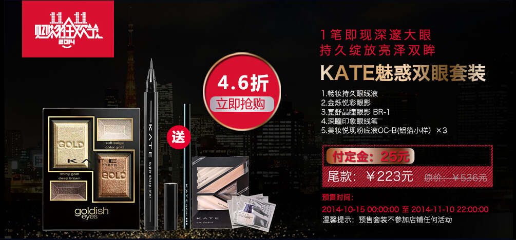 除這兩款人氣商品外,套裝中還包括寬舒晶瞳眼影+深瞳印象眼線筆+美妝悅現粉底液小樣,只要248元!