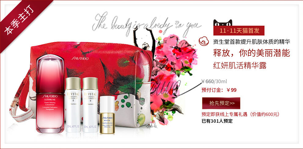 此款精華是即將于雙11當天首發的新品,限量1000份,F在預定,即可享受專屬禮遇,含悅薇潤白柔膚水EX2 20ml、悅薇潤白活膚乳20ml、悅薇珀翠馥活潤白精華液10ml及法國知名插畫設計師定制版化妝包,禮遇價值約600元。
