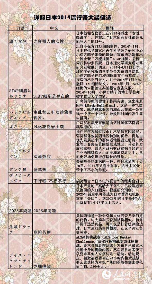日本教育出版機構U-CAN “2014年U-CAN新詞·流行語大獎”將于12月1日正式公布,11月19日,U-CAN公布了今年的50個候選詞匯。一起來看看它們具體都是什么意思吧。