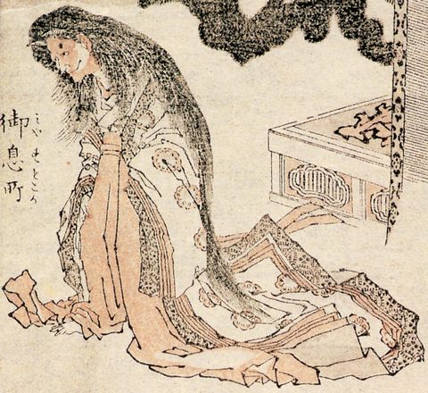 日本著名的《源氏物語》中就有一篇關于般若的故事!犊稀菲械呐鹘墙小傲鶙l御息所”(ろくじょうのみやすどころ),她做為皇太子妃曾經有過奢侈的生活,可她偏偏愛上了光源氏。但是光源氏不久就對她冷淡了下來,所以她非?鄲,開始嫉妒光源氏的正妻葵上(あおいのうえ)。后來六條御息所變為了般若,使葵上處處為難,并最終害死了葵上。