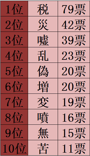 此前,Creative japan 在該公司運營的調查網站“voice note”上對“2014年度漢字”進行了調查。結果顯示,第一名為“稅”,第二名為“災”,第三名則為“謊”!皝y”、“偽”、“增”緊隨其后。