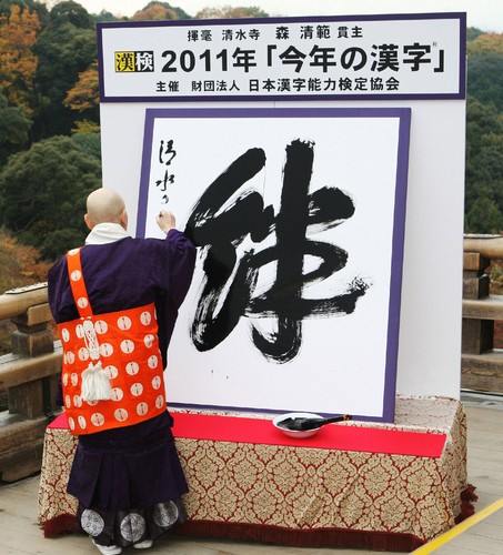 由日本漢字能力檢定協會舉辦、旨在反映日本一年世態變化的“年度漢字評選”12日公布結果,清水寺住持森清范揮筆寫下了代表日本2014年的漢字——“稅”。
