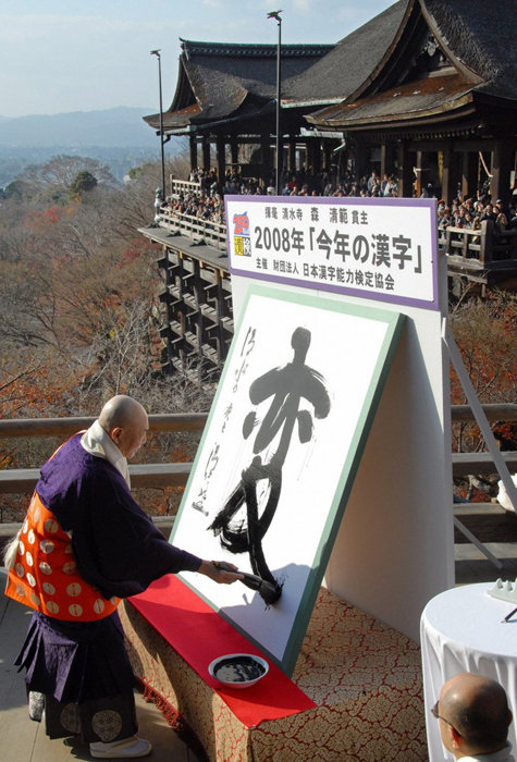 由日本漢字能力檢定協會舉辦、旨在反映日本一年世態變化的“年度漢字評選”12日公布結果,清水寺住持森清范揮筆寫下了代表日本2014年的漢字——“稅”。