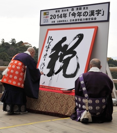 日本漢字能力檢定協會自1995年起每年年底評選出一個年度漢字,京都清水寺住持森清范12日在寺內用毛筆寫出“稅”字,正式公布了今年的年度漢字。在候選漢字中,“熱”和“噓(意為謊言)”分別排在第二位和第三位。