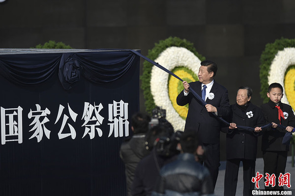 在公祭儀式上,習近平攙扶著南京大屠殺幸存者代表、85歲的夏淑琴一同走上公祭臺,為國家公祭鼎揭幕。一起參加揭幕的還有13歲的阮澤宇,他的祖輩慘死在日寇的屠刀之下。