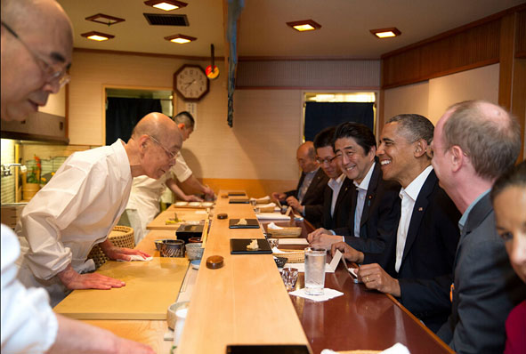 美國總統奧巴馬4月訪問日本時,曾和日本首相安倍晉三來到這家壽司店,享受年近90歲的壽司傳奇小野二郎(Jiro Ono)為他們親手制作佳肴。
