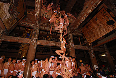 以新年第一聲鐘響為信號,系著兜襠褲的男士們從雪梯往上攀登,順著延伸至菊光堂內鱷嘴鈴的粗繩競相攀爬。如果能夠順利到達鱷嘴鈴的話,則被看做是收獲了幸福。