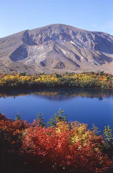 沿著磐梯吾妻SKYLINE觀光路線登山后會看到凈土平,從凈土平登上一切經山山頂后就可以看到“魔女之眼”(吾妻的五色沼)。直徑300米火山口中的湖水,隨著陽光的變化蕩漾著美妙的藍綠色,神秘異常。
