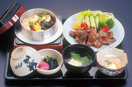 日式餐點的擺設,最基本的形式是以食用者的方向來看,左側湯碗,右側米飯碗,并呈一條橫線排列,而筷頭朝左橫放于離自己最近的位置。